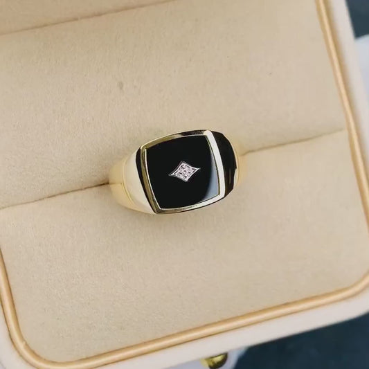 14K Two-Tone Gold Men's Black Onyx Ring Diamond