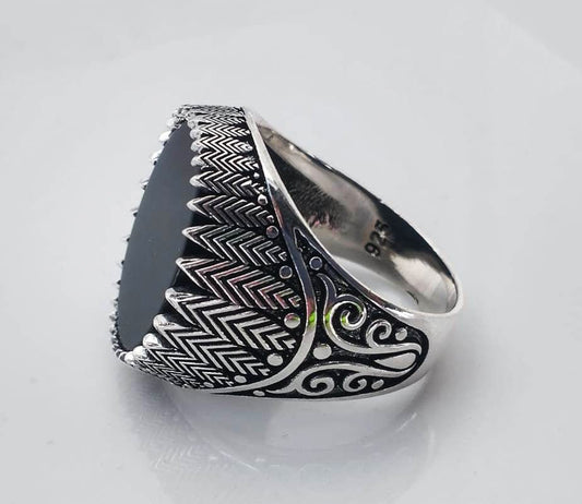 Cushion Black Onyx Victorian Ring for Men, Engraved Lily on Side Cool Ring for Husband, 925 Sterling Silver Ring, Minimalist Wedding Rings