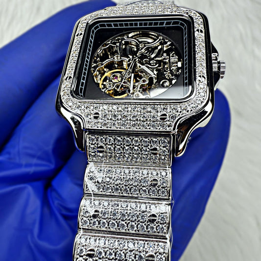 Pure Silver Automatic Men's Round Watch With Cubic Zirconia Unique Link Bracelet