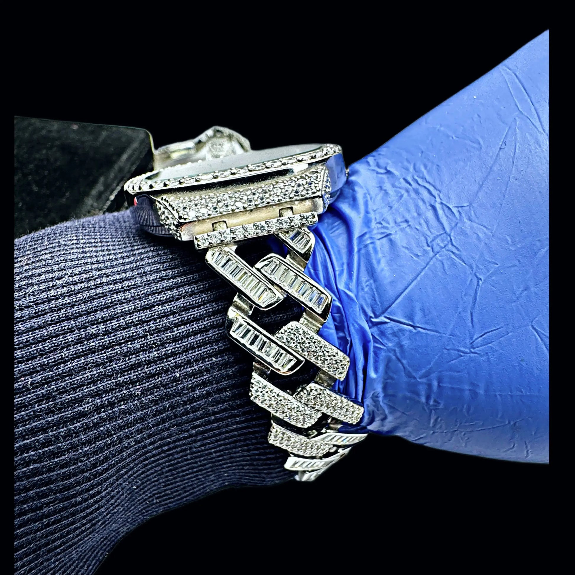 The watch bracelet is made of 925 sterling silver. Completely handmade at all stages of production. The product has a Gothic cuban curb link ornament and an absolutely unique clasp. At the request of the customer, the bracelet is also available with a blackened finish and gold plating.