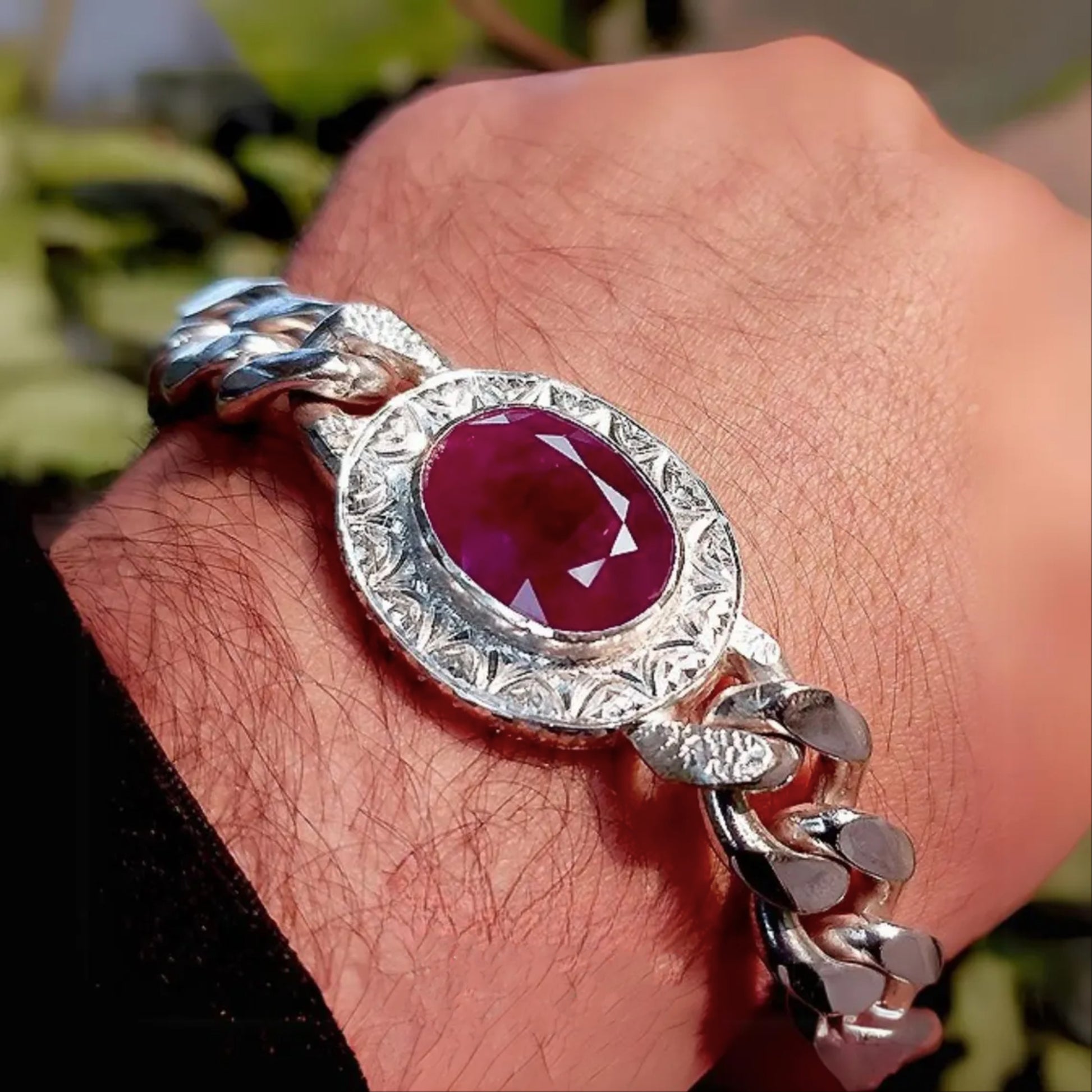This genuine garnet bracelet for men is a statement piece that combines elegance with a bold design. This red garnet bracelet is crafted in high-quality 925 sterling silver with a cuban link chain.