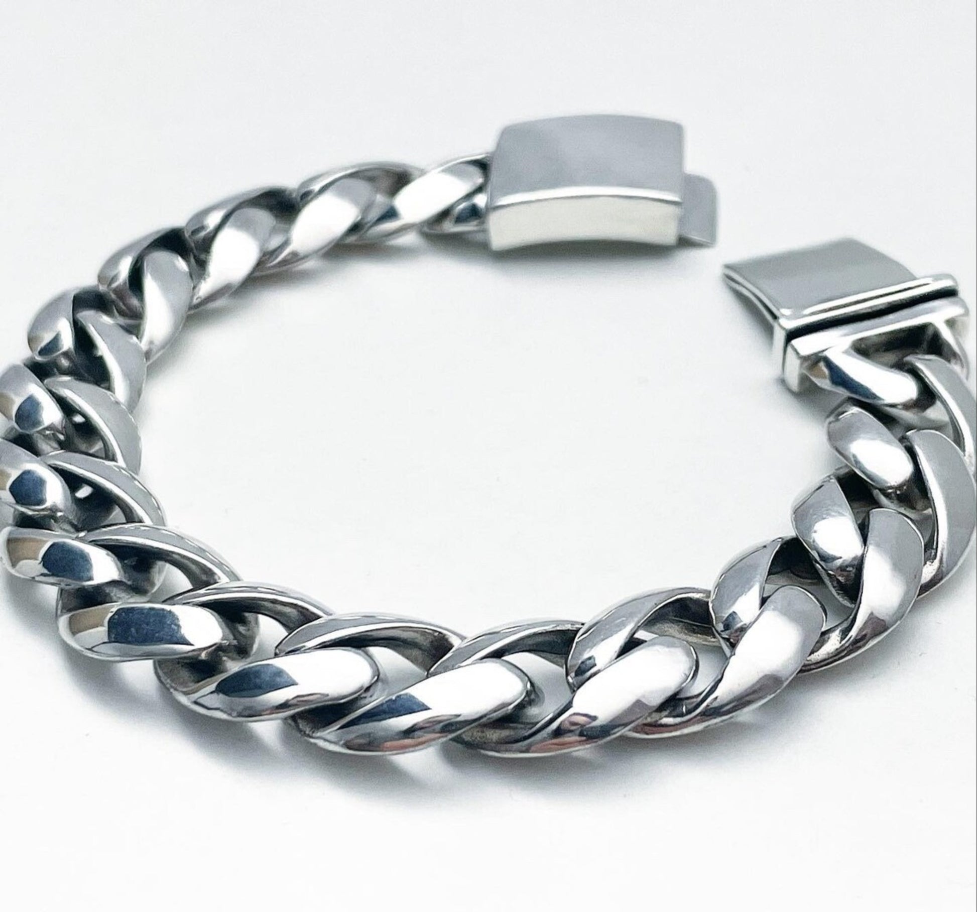 This 15mm wide bracelet features a bold curb link pattern with a high-polish finish, offering a powerful look that complements both casual and formal wear. With an impressive weight of 160 grams, it delivers unmatched durability and a premium feel on the wrist.